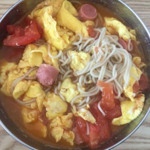 蛋全部凝固,划开,转大火下番茄,下火腿肠(番茄选稍微有点软的,这样比较容易炒出番茄汁)我加了点酱油,然后下面,我不想吃炒面,也不想吃的太汤,稍微加了点水。水开盛出就可以了。