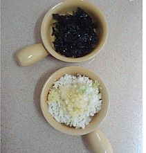 马蹄去皮切成碎粒,姜、葱切碎粒,海苔松备好。
