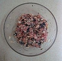 猪颈肉剁成肉糜,然后把马蹄、姜、葱粒放入。撒入海苔松、鸡精、生粉、胡椒粉、盐,淋入生抽、料酒1汤匙橄榄油、清水顺一个方向拌匀,放置10分钟。