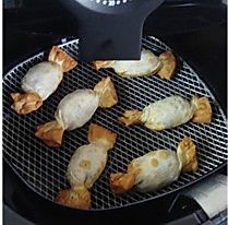 飞利浦空气炸锅预热180度约5分钟。将刷上橄榄油的云吞糖果平铺入空气炸锅的炸蓝里。设置8分钟,炸至表面金黄色即可
