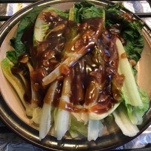 最后一步将锅内的酱倒入刚才盛出来的生菜上,大功告成