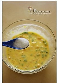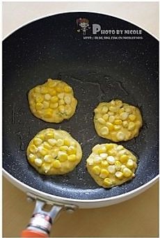 小饼表面撒一层玉米粒,小火加热,直至小饼凝固,用牙签扎一下,没有粘稠面糊说明已经熟透,即可关火。