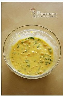 面粉与玉米面混合,打入鸡蛋,再加少许水,搅匀;