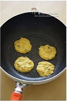 锅中刷一层油,用汤勺舀一勺面糊,摊成小饼;