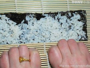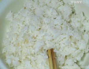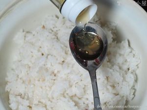 米饭还有点余温大概40度左右加入苹果醋或者寿司醋(一般都用寿司醋,