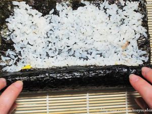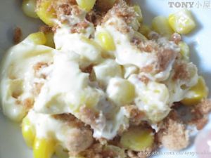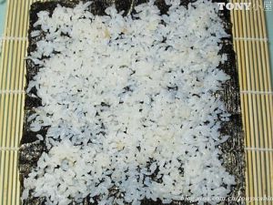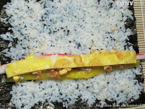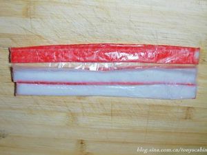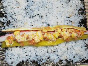 在前端放入腌萝卜条,蟹肉棒,蛋皮和拌好的色拉肉松玉米。