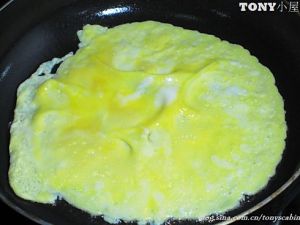 热锅后放入色拉油,拿着锅柄轻轻摇晃到四周。小火,看到蛋液干的差不多就可以了。凉了后把蛋皮切成长条。