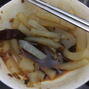 约2小时后就可以吃了。表层凉粉有点硬,口感不好。要刮去表皮,扔掉。剩下凉粉切条。拌上调味汁。
