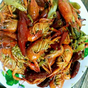 用剩下的油爆虾,听到虾壳列的声音,加大葱翻炒