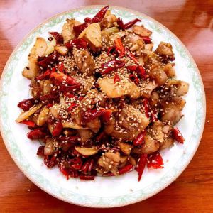 待蒜煸至金黄色,香料味道出来之后,放入尖辣椒,稍微翻炒,放入鸡肉,加少许白糖中和口味,如果觉得不咸,适当调味。