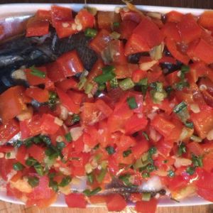 然后将红椒盖在鱼头,铺均匀。