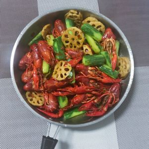 噔噔噔噔(脑补音乐) 先把小龙虾煮熟之后放在一边,在锅里加点油把之前炸过的藕片和黄瓜下锅炒一下,加点火锅底料,然后再把小龙虾下锅一起翻炒3分钟,就可以出锅啦~经济简单又美味,快来和我一起动手吧~