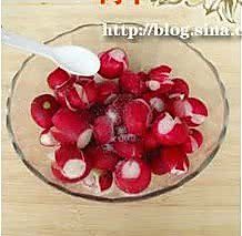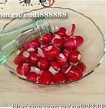 用冷开水冲去樱桃小萝卜盐分。沥干水分;