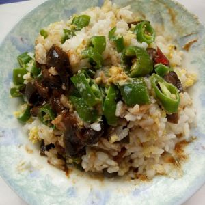档跳上去,米蒸的差不多,把鸡蛋尖椒倒进去,同时,把鱼香茄子一起倒进去。盖上,再把电饭锅档按下去!