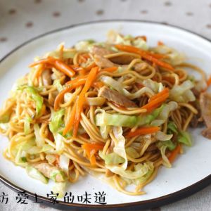 锅烧热加入食用油,放入切好的里脊肉丝,翻炒至肉丝变白后放入葱花爆香,再加入胡萝卜丝翻炒至变软