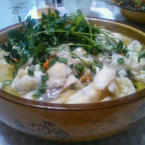 锅中烧热,下一点色拉油,放两片姜,两片蒜,3棵小葱打结,炒一下,下西红柿切成小瓣的,把酸菜下锅煸一煸,把吊好的鱼骨汤倒入锅中,烫一烫,捞出碗底,不用开也行,另起一口锅加一些凉水,以淹过鱼片为主,烧到八九十度,转小火,把腌好的鱼片一片一片放下去,煮个3到5分钟,锅里的水千万不能开,捞出铺酸菜上,把之前煮酸菜的鱼汤烧开淋在鱼片上,出锅撒上一点香菜。