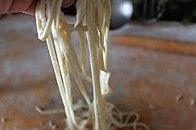 用压面机把面团擀成长片。压成宽面。