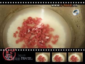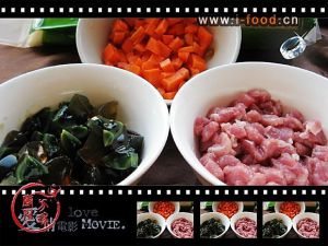 瘦肉切丁拌以少量黄酒.淀粉及盐,腌1O分钟。胡萝卜切碎,皮蛋切成小方丁