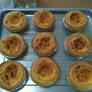 将调制好的蛋挞液依次倒入蛋挞皮里,烤箱180度预热10分钟,再将蛋挞盘放入烤箱中,中层上下火烤约20分钟(随时观察)。