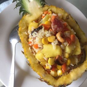 玉米 胡萝卜 芹菜 炒熟 再加上腰果其他东西 再加菠萝 加饭即可 酸酸甜甜的蛮开胃的