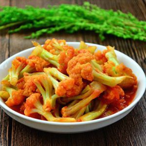 将菜花炒至熟透,表面均匀附着番茄汁即可出锅