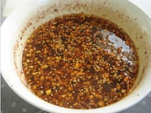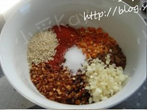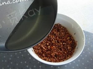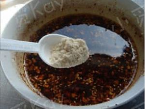 将辣椒碎、辣椒粉、花生油、老抽、白芝麻、花椒粉、盐、蚝油、蒜末放入一个耐热的大碗中,搅拌均匀。(放了辣椒碎又放辣椒粉的原因是,我买的辣椒碎不够辣,但辣椒粉却很辣,为了增加辣度,so~ 如果只放辣椒粉,做出来的辣椒油又变成酱了,so~~~)