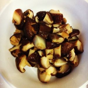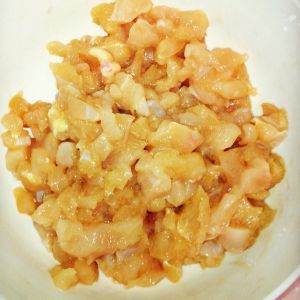 香菇用水发好,切成丁。鸡胸肉切丁,加少许盐、料酒调味。