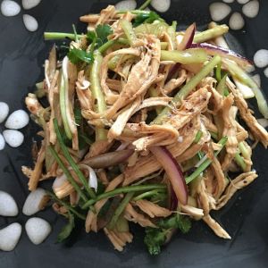 鸡肉丝,所有蔬菜丝,放生抽,盐,糖,醋,辣椒油,香油,搅拌均匀