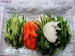 所有蔬菜切丝,干豆腐用开水煮两分钟,切小方块