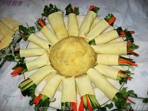 用干豆腐把蔬菜卷上,中间放上土豆泥,