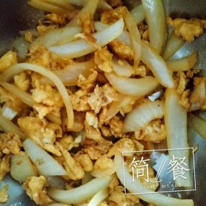 倒入鸡蛋,放少许酱油,加一勺盐,一勺糖,翻炒