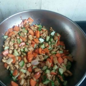 然后 倒油 放葱花 把豆瓣酱炸一下 有油油出现 把胡萝卜 倒进去 抄抄 鸡胸 鱼豆腐 黄瓜 翻腾会 倒入汁汁啦最后炒会出锅啦 开吃咯