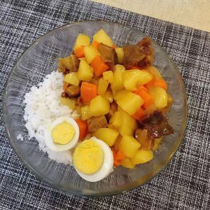锅热,加入少量油,加入食材丁翻炒三分钟,再加入适量的水,沸腾后加入咖喱块,不用放盐,等待咖喱块融化后搅拌食材,待汤汁勾芡了就可以出锅,尝一尝胡萝卜软了即可!鸡蛋切半拌着吃!