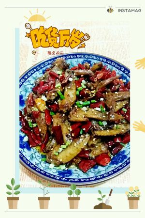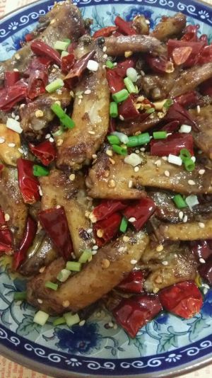 看到海椒变色了,就把鸡尖放下去,开大火爆炒下。把颜色和味道炒出来,就把火关小,放芝麻,翻炒下,就可以起锅了。
