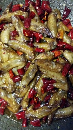 倒点油在锅里,别太多了,放花椒,老姜,三奈,开中火炒,放少许点糖,提点味。然后把干海椒倒下去炒。这个时候把火开小火,别把海椒炒糊了。