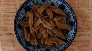 先用做好了的卤鸡尖盛在盘子里凉起。