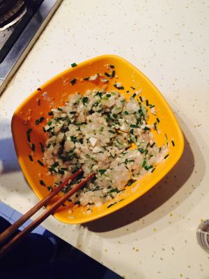 将剁碎的虾仁、葱、马蹄加上蛋清和适量生粉搅拌均匀,搅拌中加入白胡椒粉,盐和料酒。