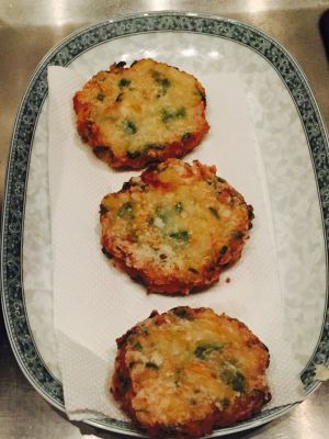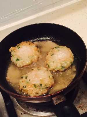 终于可以下锅煎啦,在平底锅上先放一点点油煎热,放入虾饼煎至金黄即可