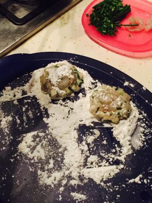 将搅拌均月的馅料团成团,拍扁加上一到两只完整的虾仁,我这点馅料大致可以做五个,在外面裹上一层生粉