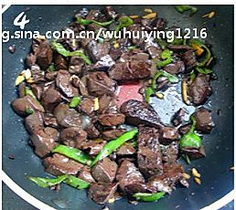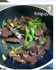 .猪血块炒变色后,倒入青椒丝一起翻炒,炒出颜色后加入适量精盐,鸡精,倒入香麻油收锅即可。