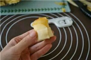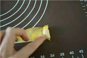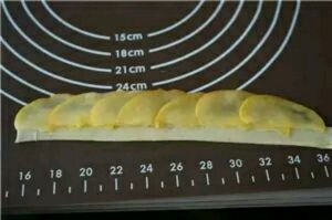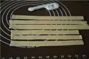 将面团擀开,尽可能薄些,这里如果不好擀,可以用油纸或者手粉帮忙,擀好后切成长条,每条的长度约25CM,宽度约1.5cm ,看苹果大小而定
