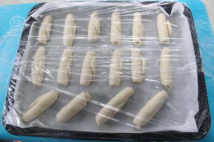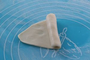 包完成后擀成长舌状,由上至下卷起