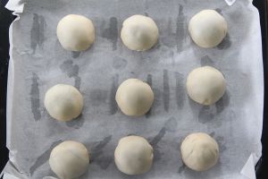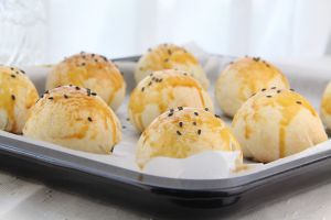 将面团把豆沙和蛋黄包裹,包成16个蛋黄酥