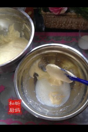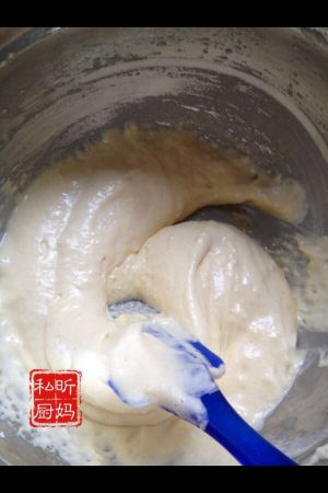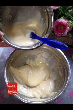 分两次,将蛋液入水份里,轻柔快速的切拌。