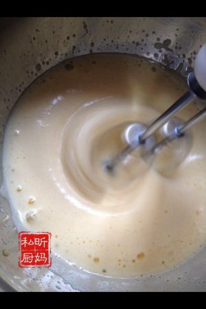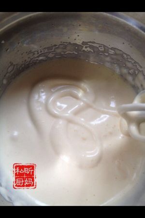 当形成明显阻力的泡沫时候,提起打蛋头,在表面画一个8字,如果10秒后才消失,就是差不多好了。改为低速打发,一分钟后,大气泡消除,蛋液趋于稳定,细腻。完成打发。