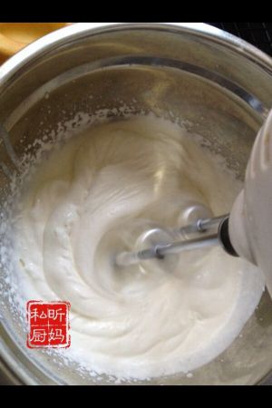 打蛋器中档,耐心打发至奶油状态。奶油打发如同蛋白霜打发一样,必须打发到位,感觉搅拌头阻力明显,纹路不易消失,插牙签能不倒。