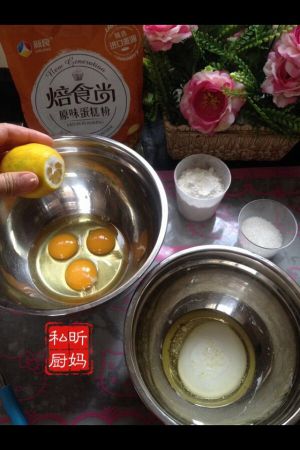 在鸡蛋盆里加入柠檬汁几滴,盐1g辅助打发,糖60g也同时加入。