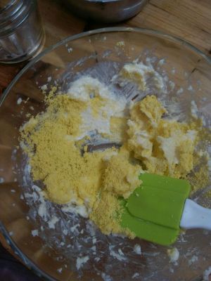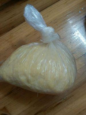 倒入保鲜袋,边揉边压成团(可能我的面粉吸水性好,成不了团,我又加了一点自制酸奶,烤好后依然酥松,原配方是没有酸奶的。),放入冰箱冷藏30分钟后取出。