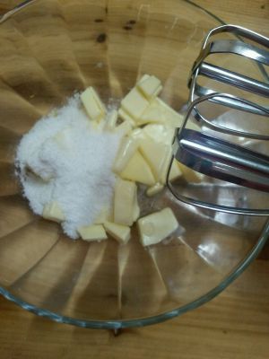 软化后的黄油加糖粉搅拌均匀,用打蛋器打至蓬松状态。
