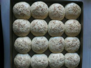 发酵至1.5倍大小,大概40分钟。取出刷蛋液,撒芝麻。(此时预热烤箱180度,上下火,大概20分钟左右)